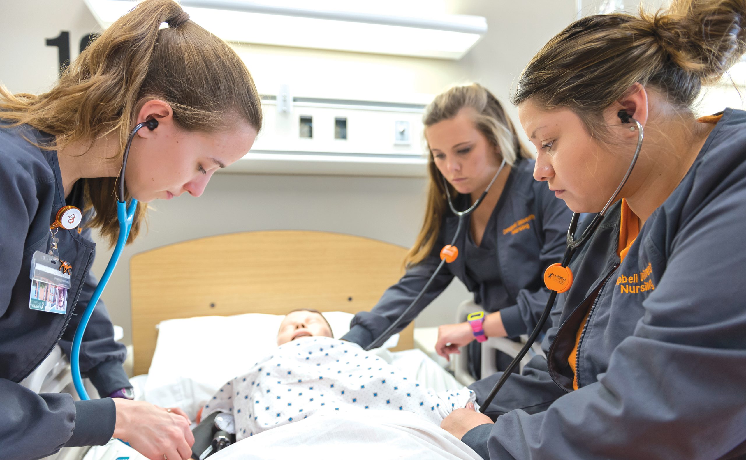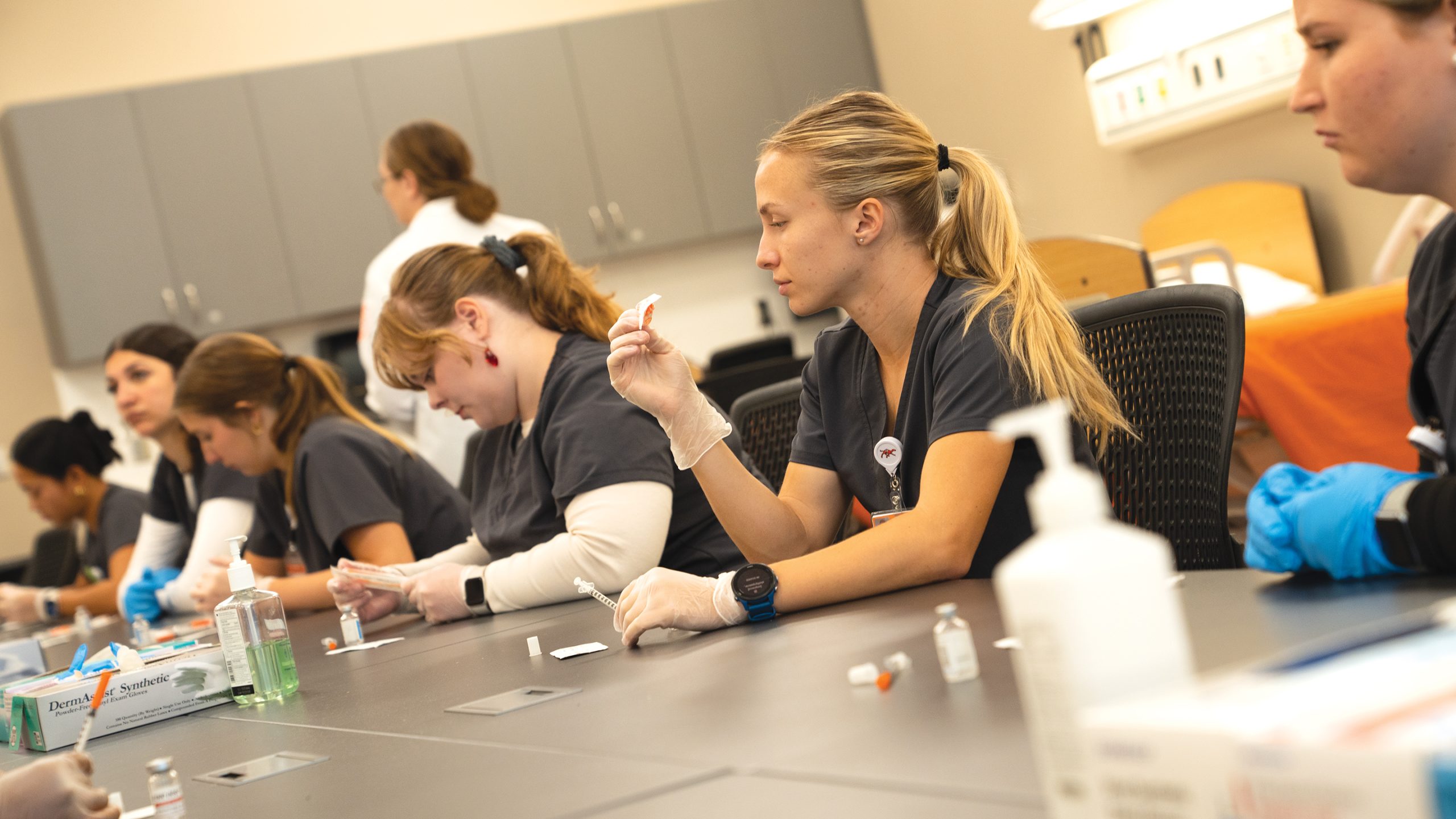 The junior year begins with 300-level courses on professional nursing practice, fundamentals of nursing practice with older adults, health assessment and concepts of pathophysiology and pharmacology. Their second semester includes courses on research- and evidence-based practice and psychiatric and mental health practice. The senior year includes courses on leadership and health policy, nursing practice of women and children, nursing roles and population health, among others. The program requires 780 hours of clinical work, which includes skills labs and the simulation center. Students also travel to area hospitals, clinics, medical centers and nursing homes and long-term care facilities for their clinical work.