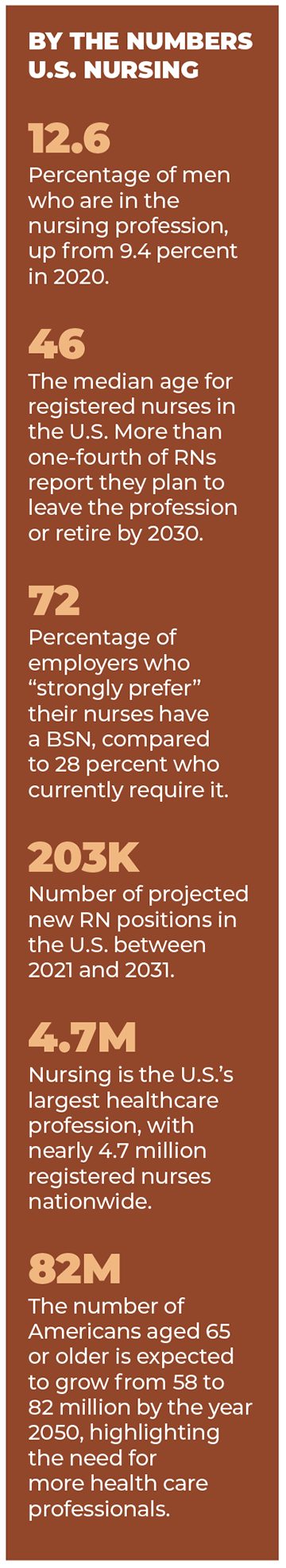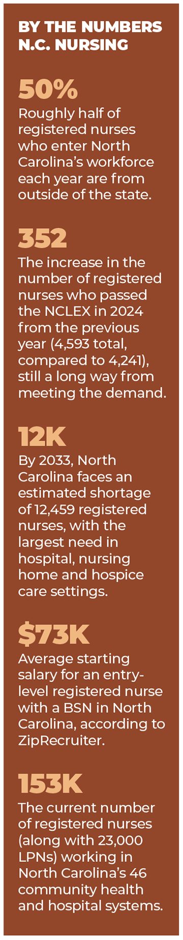The program’s popularity comes at a pivotal time for the profession, both in North Carolina and nationally. Statewide, the shortage of 12,500 registered nurses is expected by 2033, according to a 2021 study by the Cecil G. Sheps Center for Health Services Research at UNC-Chapel Hill. The North Carolina Center on the Workforce for Health says 13 percent of the state’s registered nurse positions are unfilled (higher than the national average of 10 percent).